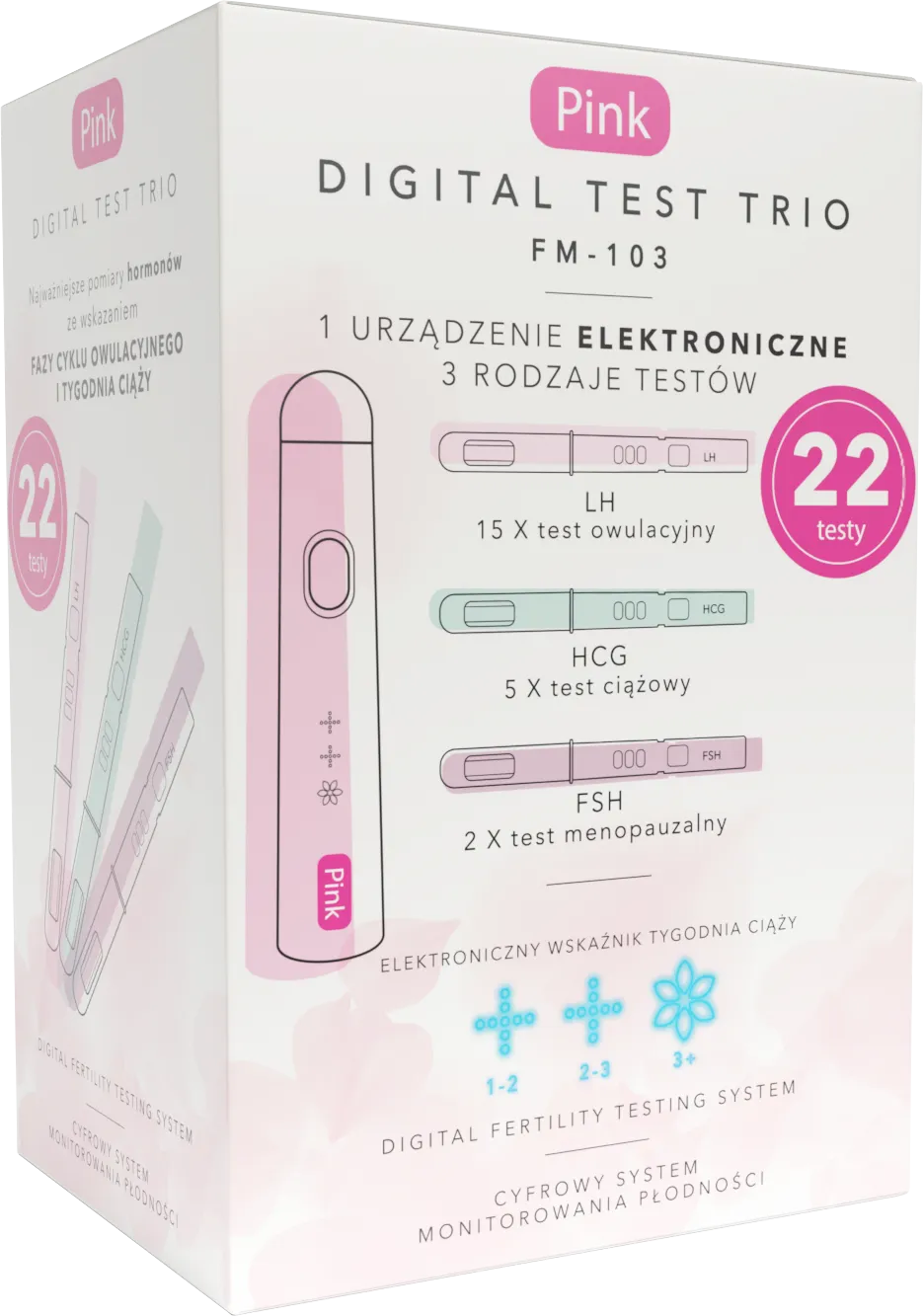 Innowacyjny Pink Digital Test Trio to nowoczesny, elektroniczny system do kompleksowego monitorowania płodności kobiet. Umożliwia wykrywanie trzech kluczowych hormonów: LH (hormon luteinizujący) do określania owulacji, HCG (gonadotropina kosmówkowa) do wczesnego wykrywania ciąży oraz FSH (hormon folikulotropowy), który może wskazywać na rezerwę jajnikową i zbliżającą się menopauzę. Zestaw dostarcza cennych informacji na każdym etapie planowania rodziny i w okresie okołomenopauzalnym.
